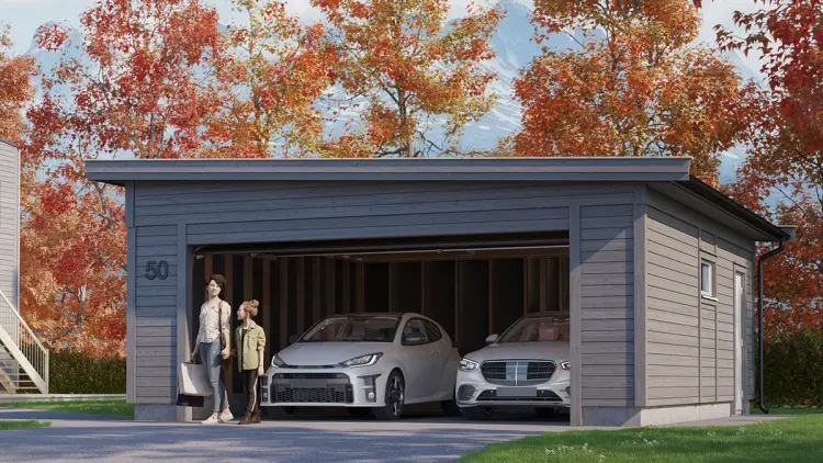 Garasje G50 S35 er en dobbelgarasje med saltak takvinkel 35 grader og dobbel port. Garasjen har mulighet for loft på 21,6 m2 og plass til innvendig bod på 5 m2. Garasjen er 50 kvadratmeter stor.