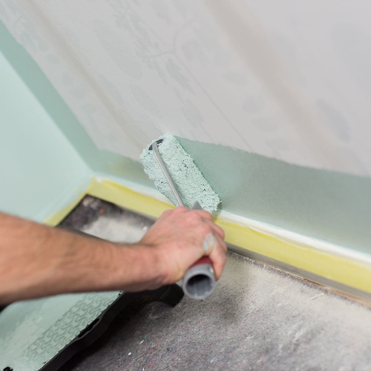 Bruk maskeringsteip og dekk til gulv og møbler, husk at malingsrullen spruter.