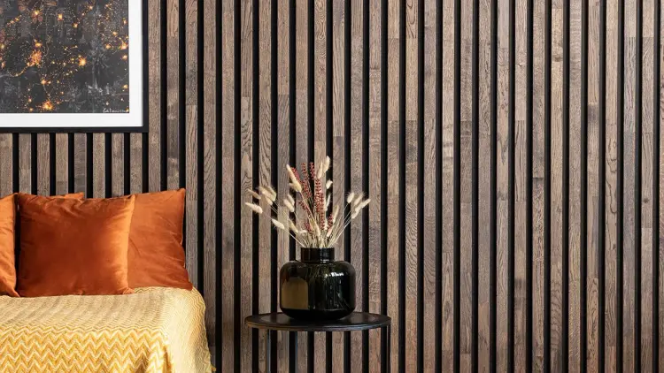 En spilevegg i tre skaper en varm og lun stemning i et ellers moderne hjem og kan være blikkfang i stua.