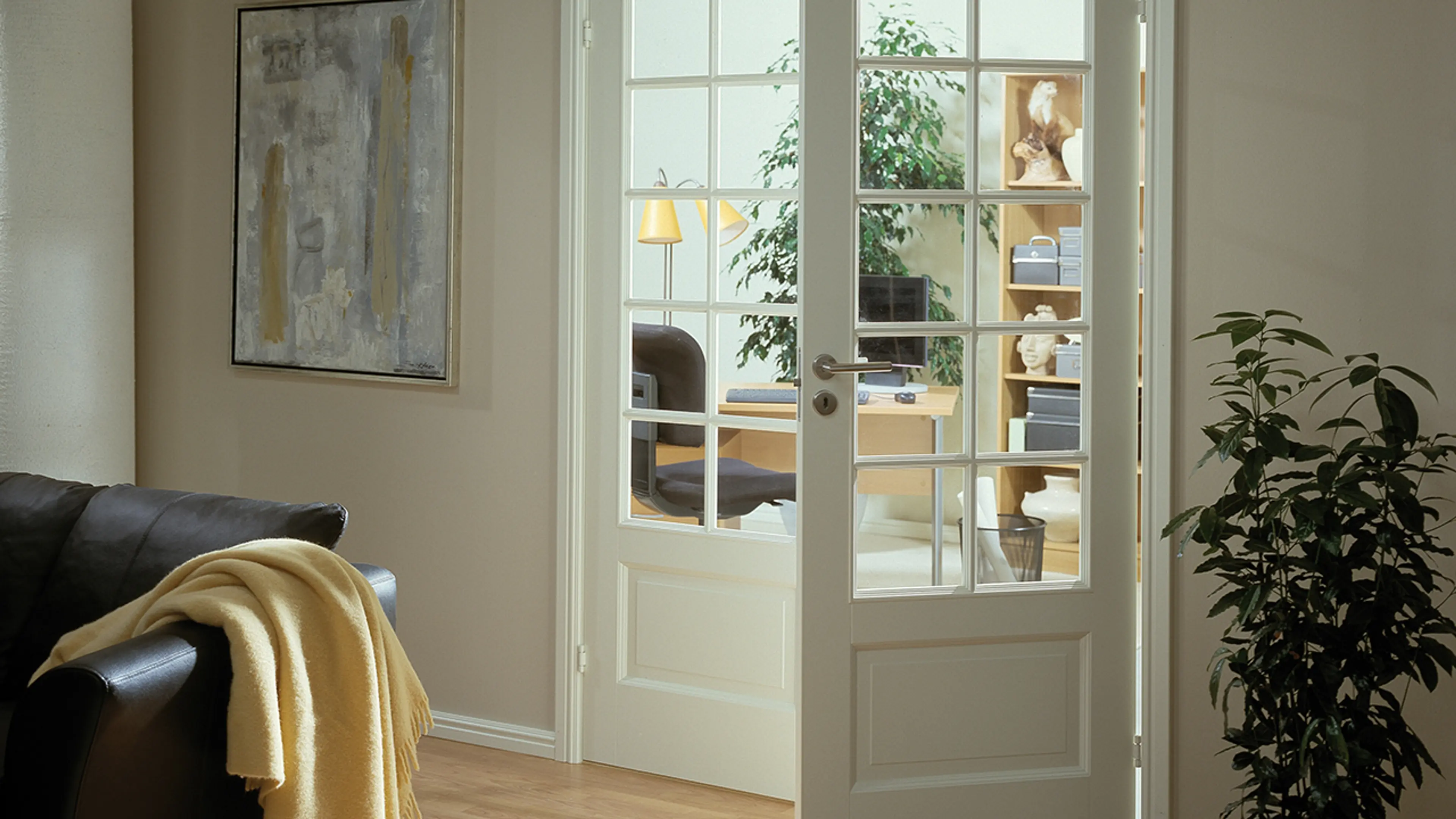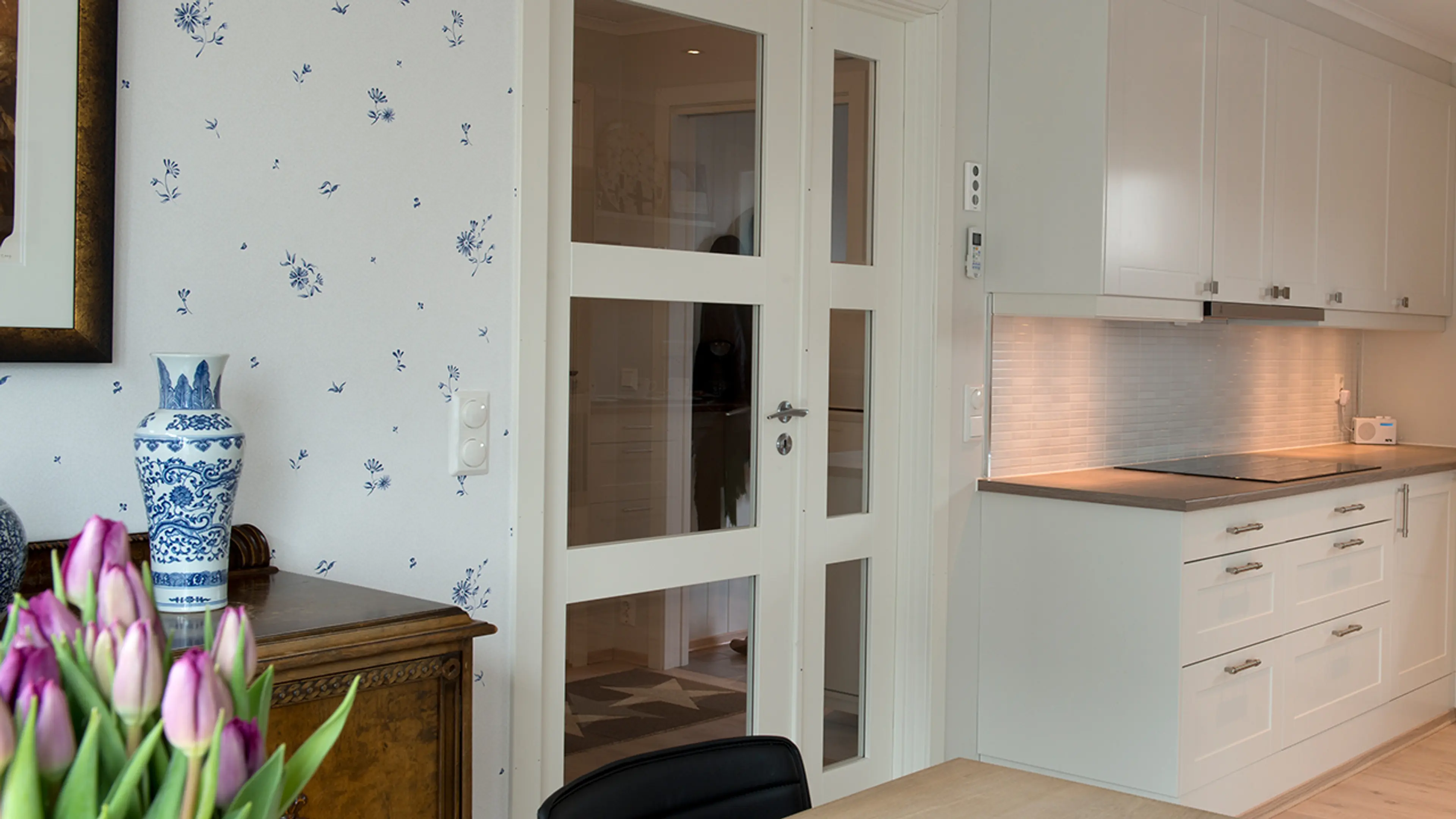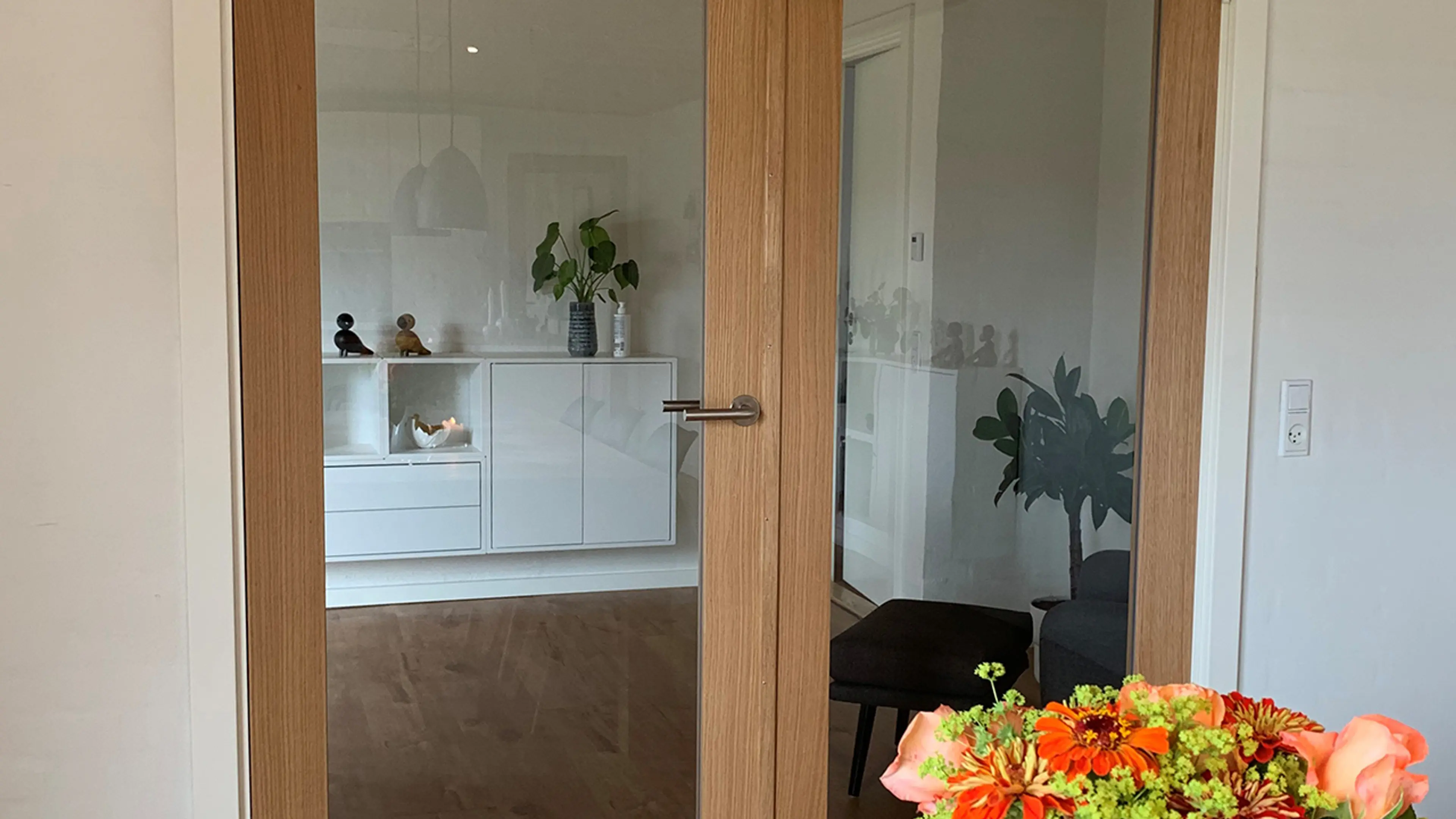 Dersom du har plass kan dobbeltdør med glass eller innerdører med sidefelt i glass være en fin måte å lede enda mer lys på, samtidig som du får et elegant uttrykk.