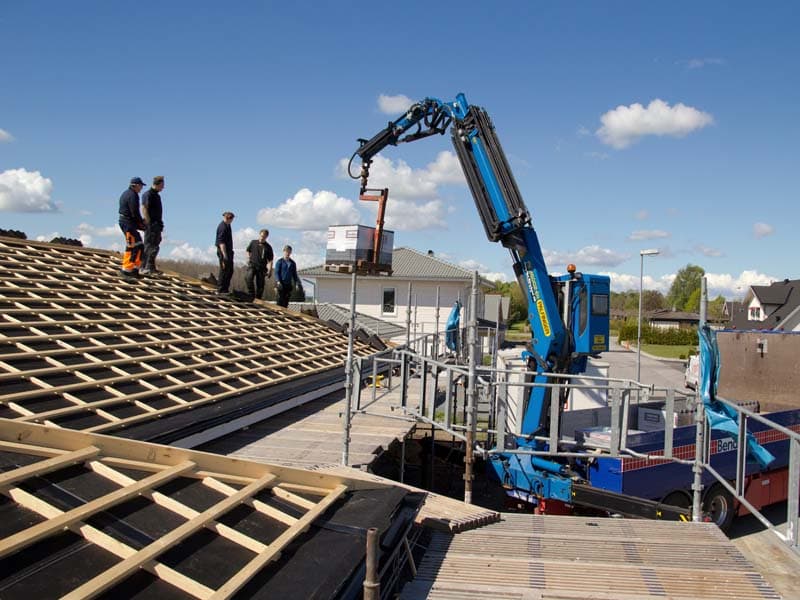 – Det alltid vil være et risikomoment i å gå rundt på et tak. Derfor løfter vi pallen direkte opp på taket og flytter den rundt etter hvert som snekkerne fordeler taksteinspakkene. På den måten blir behovet å gå rundt på taket minst mulig og det er mindre risiko for ulykker, forteller han.