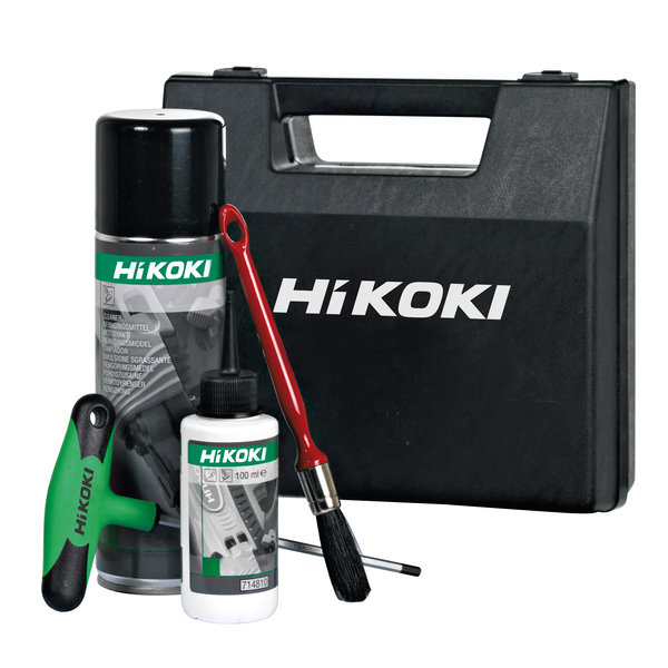 Settet består av: olje, rensespray, rengjøringsbørste, justeringsnøkkel og koffert.