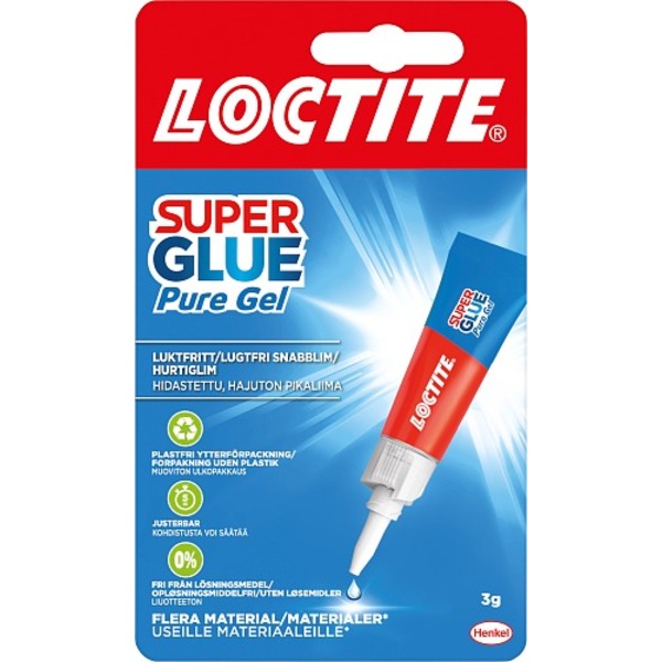 Pure Gel er lett å bruke ettersom man kan korrigerie i løpet av de første sekundene, noe som gir ekstra tid til limingen. Brukes til mindre reperasjoner. Inneholder ikke løsemiddler. Overflatene som skal limes bør være rene, tørre og tettsittende (lime fyller ikke). Påfør limet på den ene overflaten, desto tynnere lag desto raskere og sterkere resultat. Uten løsemiddler. Univarselt korrigeringsbart hurtiglim. Limer lær/gummi/tre/porselen/metall + + Plastfri ytre emballasje