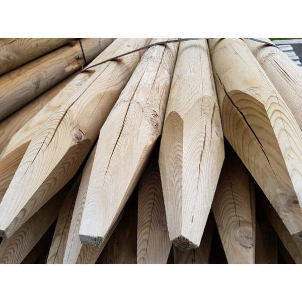 Drejede, spissade stolper av Norrlands furu. Impregnet NTR A.